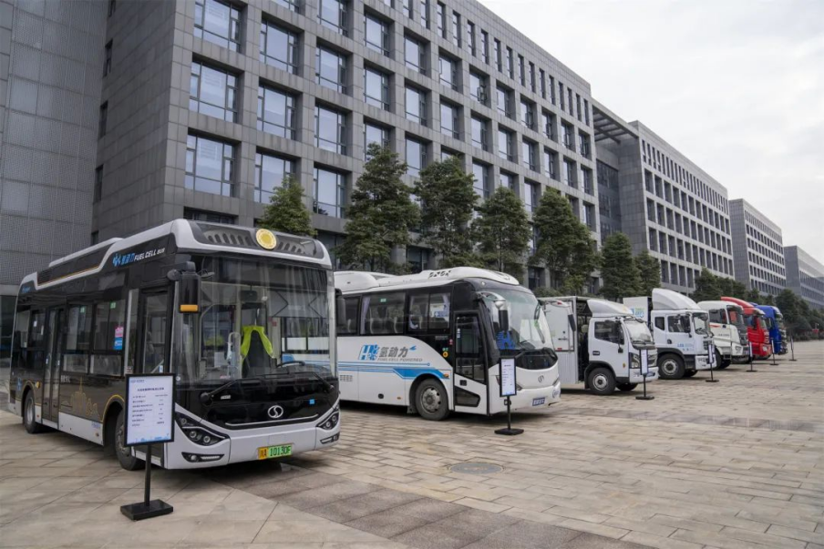 (“成渝氫走廊”啟動(dòng)暨氫燃料電池物流車首發(fā)儀式上,搭載東方電氣氫燃料電池的商用車,包括公交車、物流車、工程專用車等。)