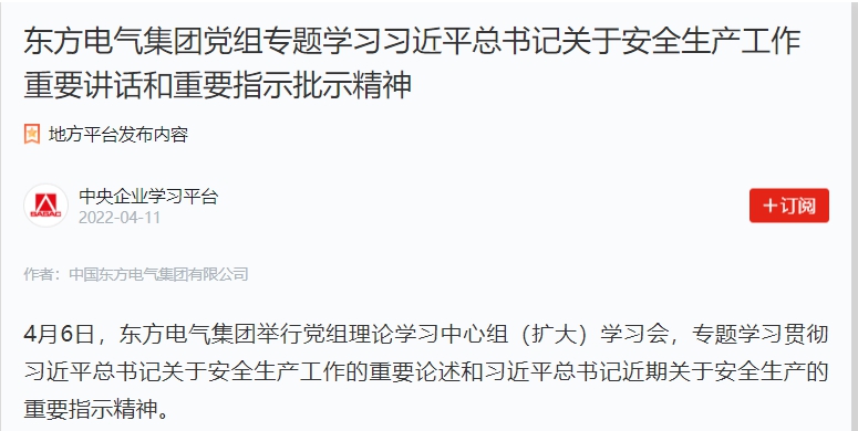 4月6日,東方電氣集團舉行黨組理論學習中心組(擴大)學習會,專題學習貫徹習近平總書記關于安全生產(chǎn)工作的重要論述和習近平總書記近期關于安全生產(chǎn)的重要指示精神。