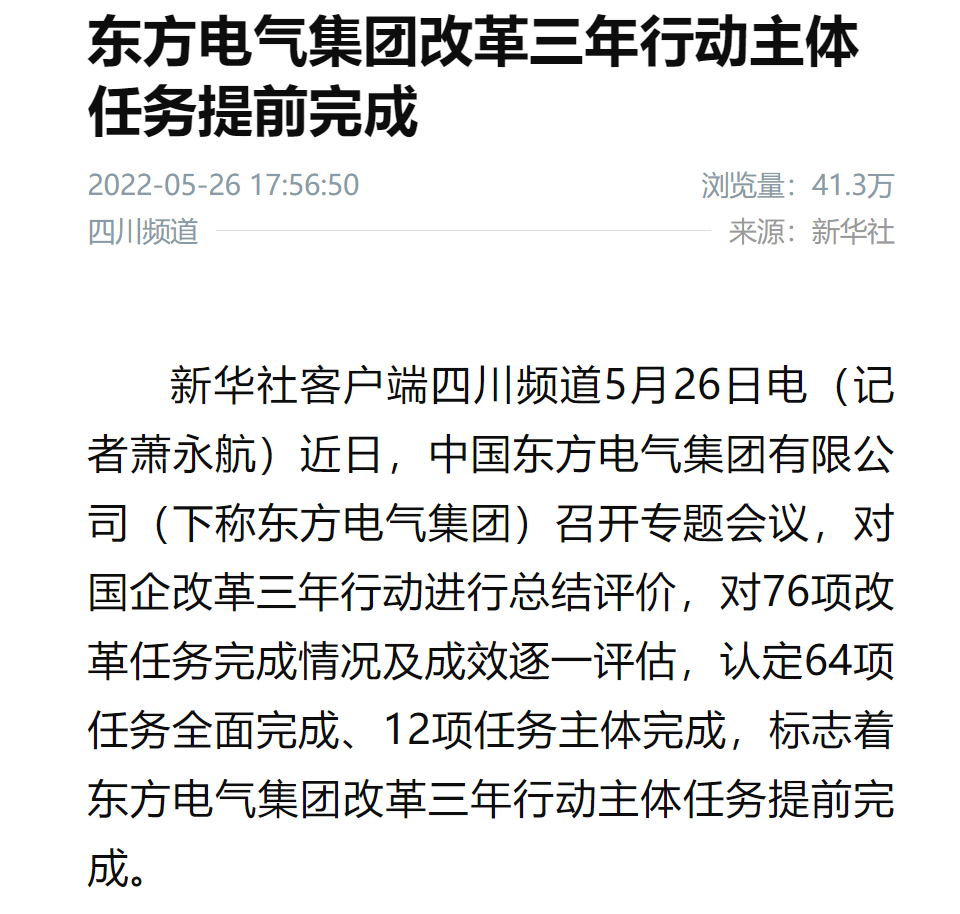 新華社客戶端四川頻道5月26日電(記者蕭永航)近日,中國東方電氣集團有限公司(下稱東方電氣集團)召開專題會議,對國企改革三年行動進行總結評價,對76項改革任務完成情況及成效逐一評估,認定64項任務全面完成、12項任務主體完成,標志著東方電氣集團改革三年行動主體任務提前完成。