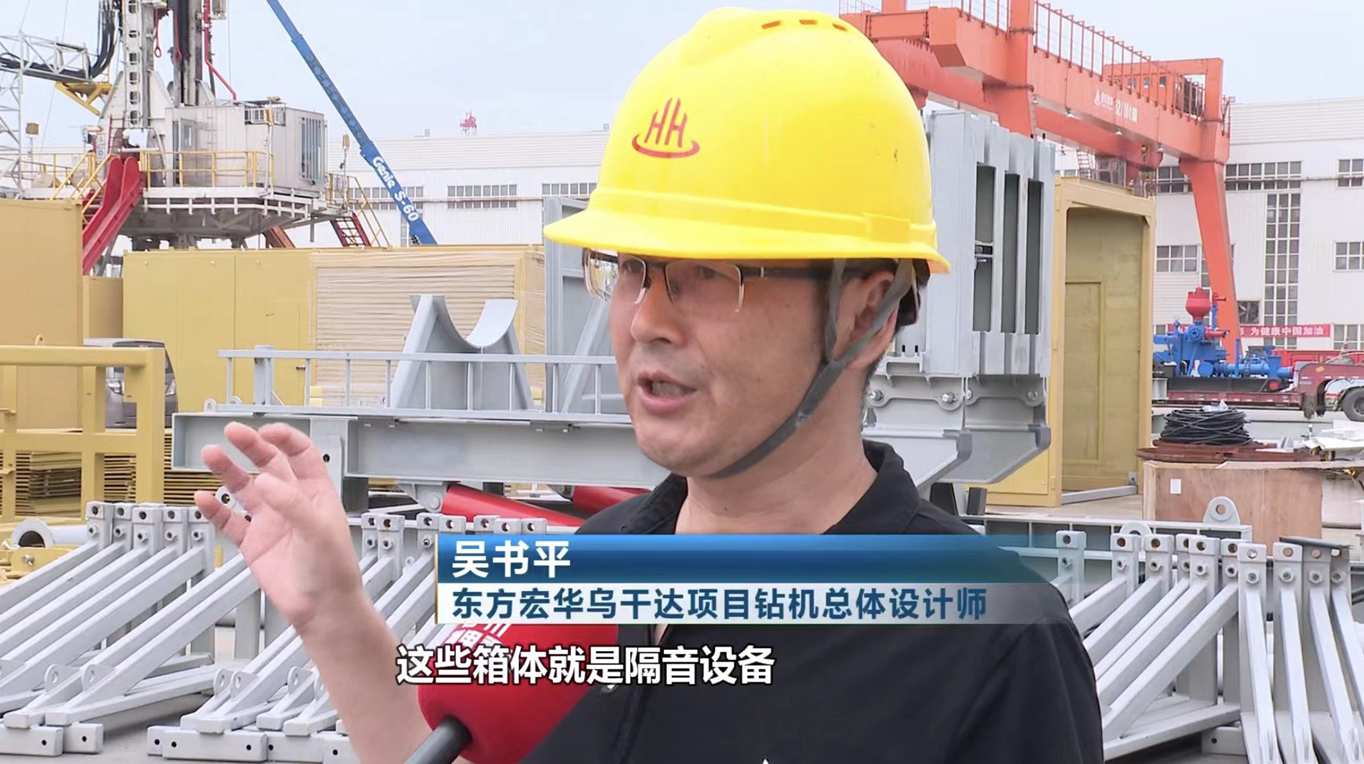 “你看這些集裝箱一樣的隔艙就是我們做的隔音措施,按照規(guī)定可以將噪音控制在五十分貝內,這是什么概念呢?我們正常講話的音量在四十分貝左右。”東方宏華烏干達項目鉆機總體設計師吳書平說。