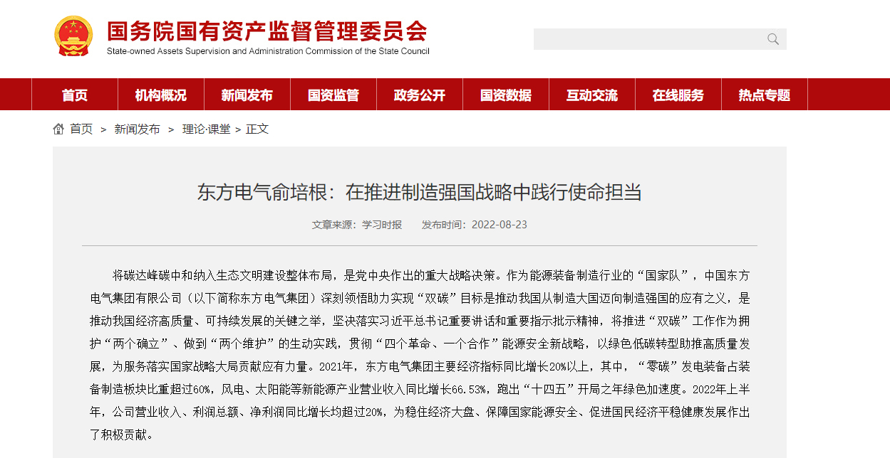 將碳達峰碳中和納入生態(tài)文明建設(shè)整體布局,是黨中央作出的重大戰(zhàn)略決策。作為能源裝備制造行業(yè)的“國家隊”,中國東方電氣集團有限公司(以下簡稱東方電氣集團)深刻領(lǐng)悟助力實現(xiàn)“雙碳”目標(biāo)是推動我國從制造大國邁向制造強國的應(yīng)有之義,是推動我國經(jīng)濟高質(zhì)量、可持續(xù)發(fā)展的關(guān)鍵之舉,堅決落實習(xí)近平總書記重要講話和重要指示批示精神,將推進“雙碳”工作作為擁護“兩個確立”、做到“兩個維護”的生動實踐,貫徹“四個革命、一個合作”能源安全新戰(zhàn)略,以綠色低碳轉(zhuǎn)型助推高質(zhì)量發(fā)展,為服務(wù)落實國家戰(zhàn)略大局貢獻應(yīng)有力量。2021年,東方電氣集團主要經(jīng)濟指標(biāo)同比增長20%以上,其中,“零碳”發(fā)電裝備占裝備制造板塊比重超過60%,風(fēng)電、太陽能等新能源產(chǎn)業(yè)營業(yè)收入同比增長66.53%,跑出“十四五”開局之年綠色加速度。2022年上半年,公司營業(yè)收入、利潤總額、凈利潤同比增長均超過20%,為穩(wěn)住經(jīng)濟大盤、保障國家能源安全、促進國民經(jīng)濟平穩(wěn)健康發(fā)展作出了積極貢獻。