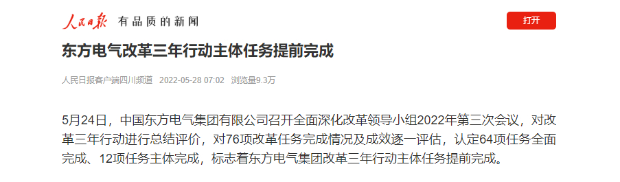 5月24日,中國東方電氣集團有限公司召開全面深化改革領(lǐng)導小組2022年第三次會議,對改革三年行動進行總結(jié)評價,對76項改革任務完成情況及成效逐一評估,認定64項任務全面完成、12項任務主體完成,標志著東方電氣集團改革三年行動主體任務提前完成。