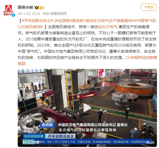 【#開年迎新訪名企#|#全國每4度電有1度由東方電氣生產(chǎn)裝備提供##中國爭氣機(jī)G50成功商用#】全國每四度電中,就有一度由@東方電氣集團(tuán)生產(chǎn)的裝備提供。燃?xì)廨啓C(jī)被譽(yù)為裝備制造業(yè)皇冠上的明珠。不甘心于一顆螺釘都有可能受制于人,汶川地震中遭受重創(chuàng)的東方汽輪機(jī)廠,在尚未完成重建時(shí)便毅然開啟了自主燃機(jī)的研制。2023年,首臺(tái)全國產(chǎn)化F級(jí)50兆瓦重型燃?xì)廨啓C(jī)G50成功商用,被譽(yù)為中國“爭氣機(jī)”。中國東方電氣集團(tuán)有限公司黨組書記、董事長俞培根表示,自主燃機(jī)的突破,為我國的供應(yīng)鏈產(chǎn)業(yè)鏈自主可控提供了很大的支撐。