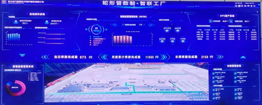 作為大型能源裝備制造領(lǐng)域復(fù)雜產(chǎn)品多工序集成智能制造樣板工程,該工廠廣泛應(yīng)用機(jī)器人、AGV、智能焊接集群、工業(yè)互聯(lián)網(wǎng)、人工智能、數(shù)字孿生等新一代制造技術(shù)和信息技術(shù),并集成了數(shù)字化備料中心和數(shù)字化管屏自動(dòng)生產(chǎn)線,為全面掌握工廠運(yùn)行狀態(tài)和智能化決策提供數(shù)據(jù)支撐,實(shí)現(xiàn)了生產(chǎn)計(jì)劃自動(dòng)化、管料加工自動(dòng)化、焊接加工自動(dòng)化、在線檢測(cè)自動(dòng)化、物料轉(zhuǎn)運(yùn)自動(dòng)化,構(gòu)建起蛇形管“套圈”生產(chǎn)的全新模式,做到讓生產(chǎn)更高效、作業(yè)更安全、質(zhì)量更可靠,設(shè)備數(shù)字化率達(dá)到100%,人均產(chǎn)值提升250%。
