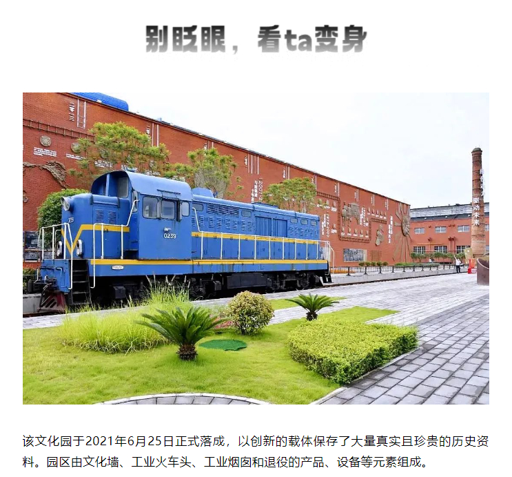 該文化園于2021年6月25日正式落成,以創(chuàng)新的載體保存了大量真實(shí)且珍貴的歷史資料。園區(qū)由文化墻、工業(yè)火車頭、工業(yè)煙囪和退役的產(chǎn)品、設(shè)備等元素組成。