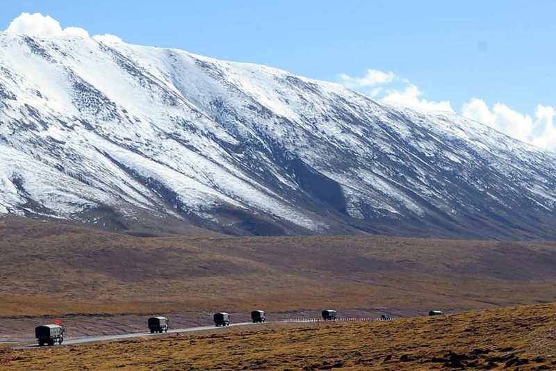 ??2014年9月27日,一個車隊行駛在通往唐古拉山口的途中。青藏公路像一條潔白的哈達(dá),橫亙在平均海拔4000米以上的青藏高原。新華社記者 王頌 攝