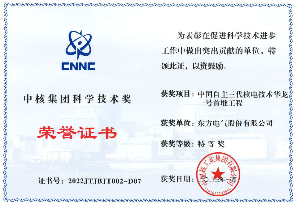 鑒于在“中國自主三代核電技術(shù)華龍一號首堆工程”研發(fā)和供貨工作中的突出貢獻(xiàn),近日東方電氣榮獲中核集團(tuán)科學(xué)技術(shù)獎特等獎。