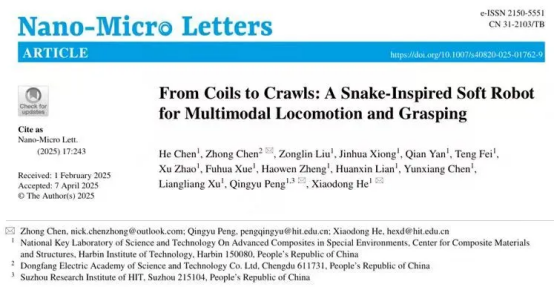 相關(guān)成果以《From Coils to Crawls: A Snake-Inspired Soft Robot for Multimodal Locomotion and Grasping》為題,東方研究院陳仲博士與哈爾濱工業(yè)大學(xué)赫曉東院士、彭慶宇教授為共同通訊作者。