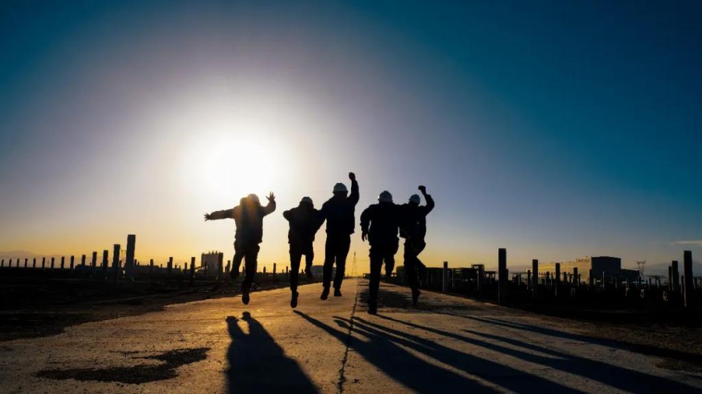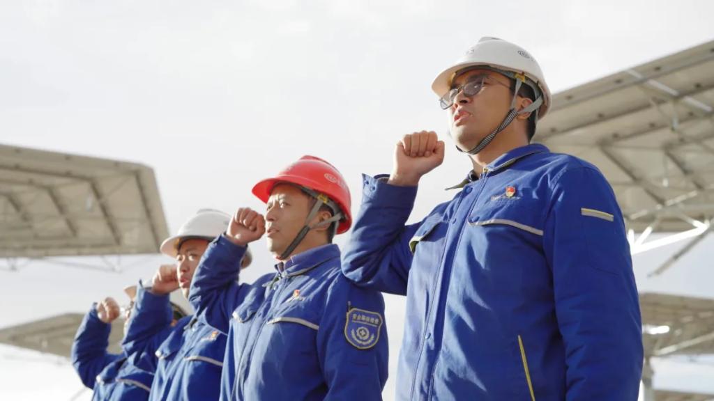 “立邊疆、戰(zhàn)戈壁、斗酷暑、抗嚴冬,誓要啃下這塊硬骨頭?!笔枪鉄釄F隊對自己的激勵,也是他們對用戶的承諾。從集光到追光,這支年輕的團隊留下了鏗鏘有力的奮斗印記,成功攻克多項“卡脖子”技術(shù),最終掌握了高效利用太陽能的“綠色原理”。2021年6月18日,哈密光熱項目正式開啟“24小時不間斷”發(fā)電模式。如今,14500臺閃閃發(fā)光的五邊形定日鏡優(yōu)雅的矗立在蒼穹之下,如同向日葵,追逐著太陽,點亮了萬家燈火。主動請纓 義無反顧挑戰(zhàn)“生命禁區(qū)”當哈密的璀璨星空映照著萬家燈火,阿克塞的11960朵“向日葵”正悄然綻放在四十里戈壁,與光伏“海洋”交相輝映。在這份“金色答卷”的背后,卻有著不為人知的艱辛與付出。在甘肅酒泉阿勒騰鄉(xiāng)的廣袤土地上,喧囂的工地現(xiàn)場,一群身著藍色工作服的人正在穿梭其中。這里是海拔2900米的阿克塞,也是東方電氣首個自主知識產(chǎn)權(quán)的110兆瓦光熱項目建設(shè)現(xiàn)場。