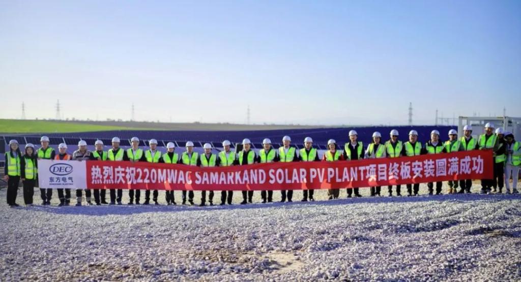 本網(wǎng)訊 3月30日,由東方電氣集團(tuán)所屬企業(yè)東方國際總承包的烏茲別克斯坦撒馬爾罕光伏項(xiàng)目舉行最終光伏板安裝儀式。四川省副省長左永祥,東方電氣集團(tuán)黨組成員、副總經(jīng)理李忠軍出席終板安裝儀式。