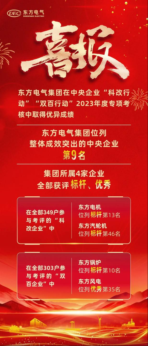 近本網(wǎng)訊 日,國務(wù)院國資委發(fā)布中央企業(yè)“科改行動”“雙百行動”2023年度專項考核結(jié)果,東方電氣集團在推進“科改行動”“雙百行動”整體成效突出的34家中央企業(yè)中位列第9名。東方電氣集團所屬4家企業(yè)均取得優(yōu)異成績,其中東方電機、東方汽輪機分別位列“科改行動”標桿企業(yè)第13名、標桿企業(yè)第46名,東方鍋爐、東方風(fēng)電分別位列“雙百行動”標桿企業(yè)第10名、優(yōu)秀企業(yè)第35名。