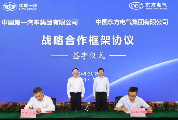 本網(wǎng)訊 9月25日,中國東方電氣集團(tuán)有限公司與中國第一汽車集團(tuán)有限公司在蓉簽署戰(zhàn)略合作框架協(xié)議。在東方電氣集團(tuán)黨組書記、董事長俞培根,中國一汽集團(tuán)黨委書記、董事長邱現(xiàn)東的共同見證下,東方電氣集團(tuán)黨組成員、副總經(jīng)理孫國君,中國一汽集團(tuán)黨委常委、副總經(jīng)理吳碧磊代表雙方簽字。