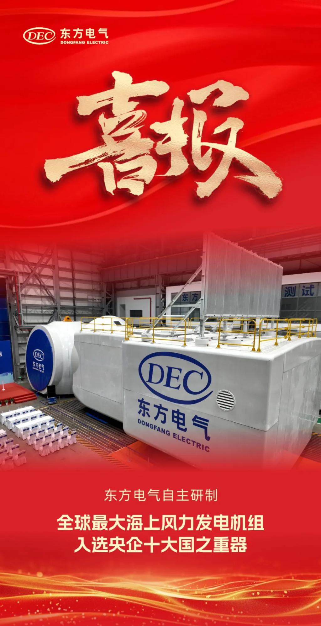 1月1日,國務(wù)院國資委新聞中心正式發(fā)布2024年度央企十大國之重器,由東方電氣研制的“全球最大海上風(fēng)力發(fā)電機(jī)組”成功入選。繼“全新一代18兆瓦海上直驅(qū)風(fēng)電機(jī)組”后,東方電氣海上風(fēng)電產(chǎn)品再次入選央企十大國之重器。